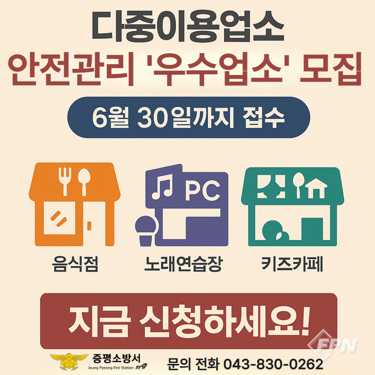 [FPN 정재우 기자] = 증평소방서(서장 손덕주)는 ‘2025년 다중이용업소 안전관리 우수업소’를 오는 6월까지 모집한다고 7일 밝혔다.