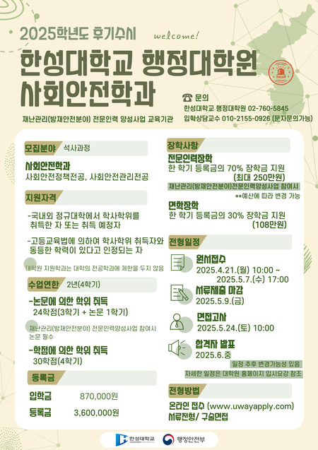 [FPN 정재우 기자] = 한성대학교 행정대학원(원장 최천근) 사회안전학과가 2025년 후기 수시 석사과정 신입생을 모집한다.