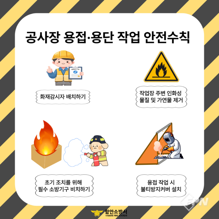 [FPN 정재우 기자] = 함안소방서(서장 최경범)는 공사장 용접ㆍ용단 작업 중 발생할 수 있는 화재를 예방하기 위해 안전수칙을 홍보한다고 24일 밝혔다.