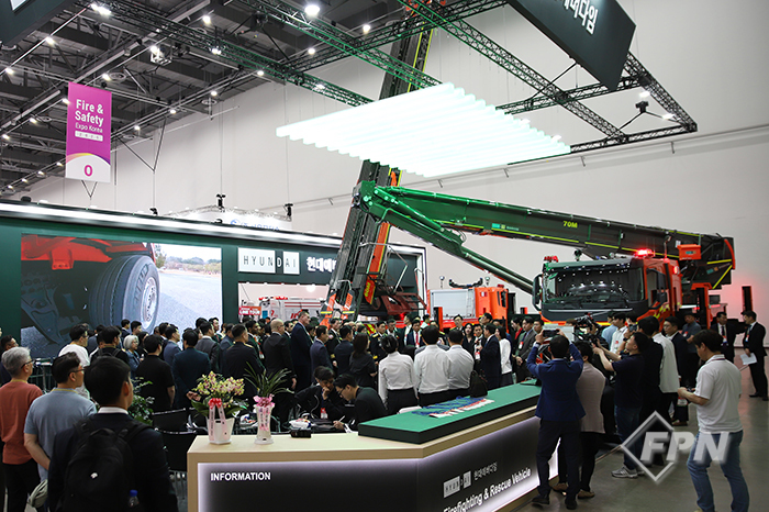 (주)현대에버다임(대표 임명진)은 첨단 소방기술과 운용자의 편의성을 극대화한 70m 소방굴절차와 최근 개발을 완료한 60m급 소방사다리차를 선보이며 눈길을 끌었다.