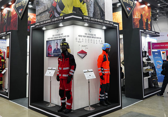 (주)고어코리아(대표 한경희)는 글로벌 소재 과학기업 고어 사의 한국 판매법인이다. 이번 박람회에선 난연성을 갖춘 신소재 고어텍스 크로스텍 파이라드 스트레치 원단 소재를 적용한 구조복을 선보였다.