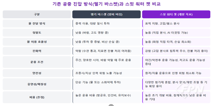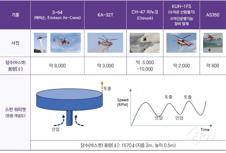 간헐적 주수 방식을 통한 기존 화재진압의 가장 대표적인 사례는 헬기를 사용하는 방식과 이번에 새롭게 제시한 ‘스핏 워터 젯’ 방식이 있다.