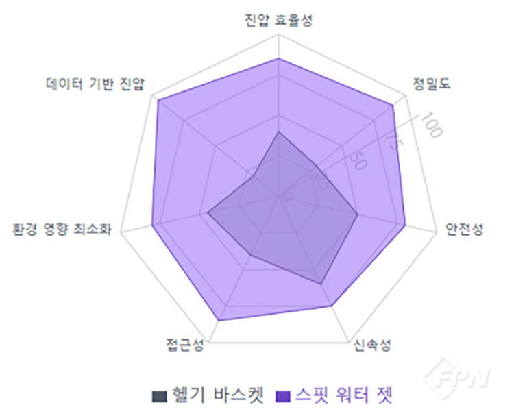 스핏 워터 젯은 물을 저장 장치에 저장하고 회전력에 의해 주수한 후 저속 시엔 중심부에서 용수를 주입하고 다시 설정된 회전 시엔 주수를 반복하는 방식으로 운영된다. 하나의 저장 장치가 헬기 1대의 역할을 해낼 수 있다.