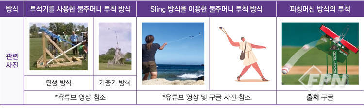국립소방연구원 TF팀은 스핏 워터 젯 외에 간헐적 방식에서 투석기와 Sling, 피칭머신 등의 방식을 통한 물 저장 용기의 투척 방식도 분석하고 있다.