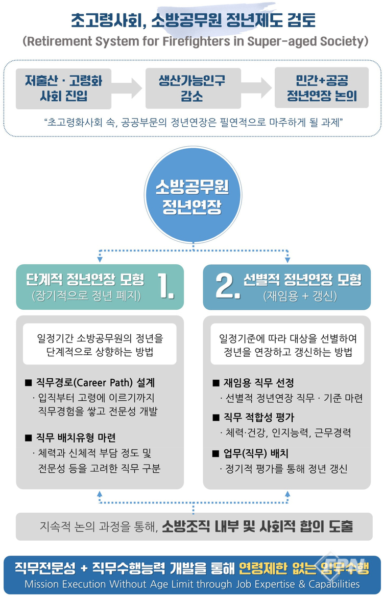 생산 가능 인구가 줄며 사회 전반에서 정년 연장 시행이 예상되는 만큼 소방공무원 정년 연장도 예정된 미래로 볼 수 있다. 조직 체계의 이 같은 다변화에 소방은 어떻게 대비해야 할까?