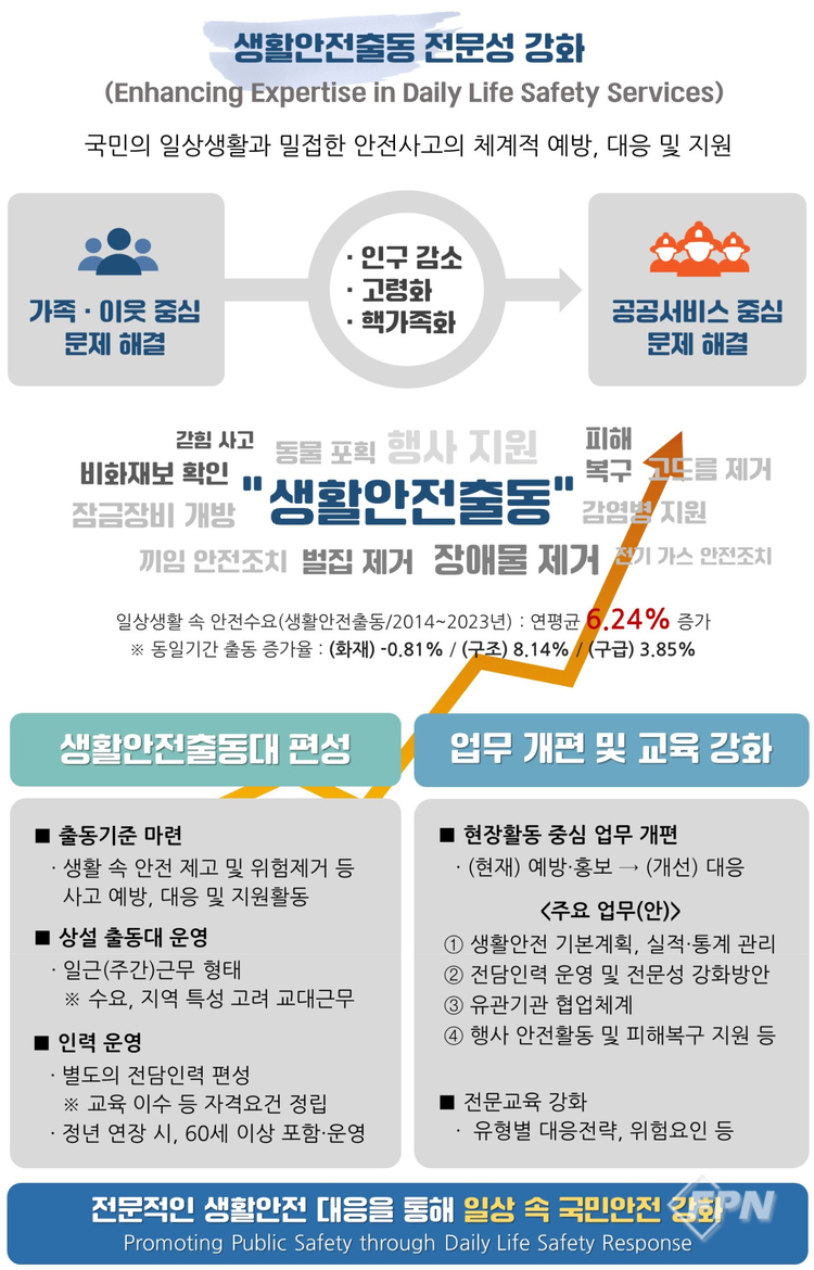 이 밖에도 예방ㆍ홍보 중심의 생활안전 관련 업무 체계를 대응활동 위주로 개편하고 전문 교육을 통해 전담 인력의 전문성을 강화해야 한다고 봤다. 맞춤형 장비 개발ㆍ개선과 관계 기관 협업 체계 구축도 중요 과제로 꼽았다.