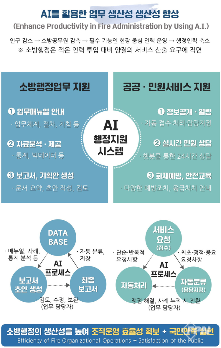 이에 위원회는 소방 업무에 AI 도입을 제언했다. AI 활용 분야를 조직 내부 업무 처리를 지원하는 ‘행정업무 지원’ 분야와 국민을 대상으로 편의를 제공하는 ‘공공서비스 지원’ 분야로 구분하고 적극 활용해야 한다는 주장이다.