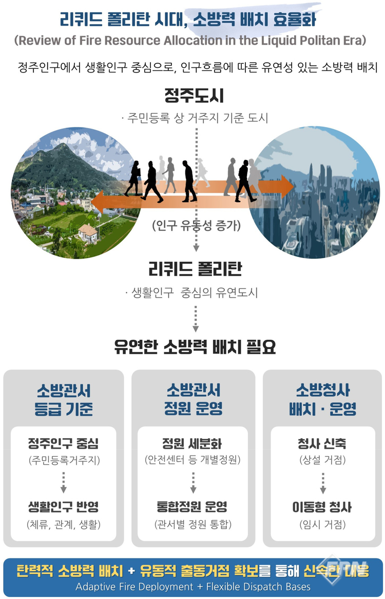 이 밖에도 탄력적인 소방력 운용을 위해 ‘소방관서 통합정원’과 ‘이동형 소방청사’ 도입을 고려해 볼 수 있다고 제언했다.