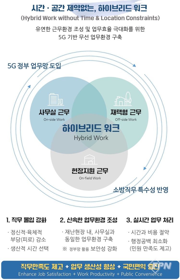 이에 위원회는 현재 일부 정부 부처에서 활용 중인 5G 정부 업무망을 기반으로 재택ㆍ사무실 근무, 현장 지원 근무를 탄력적으로 오가는 하이브리드 워크(Hybrid Work)를 시행해야 한다고 강조했다.