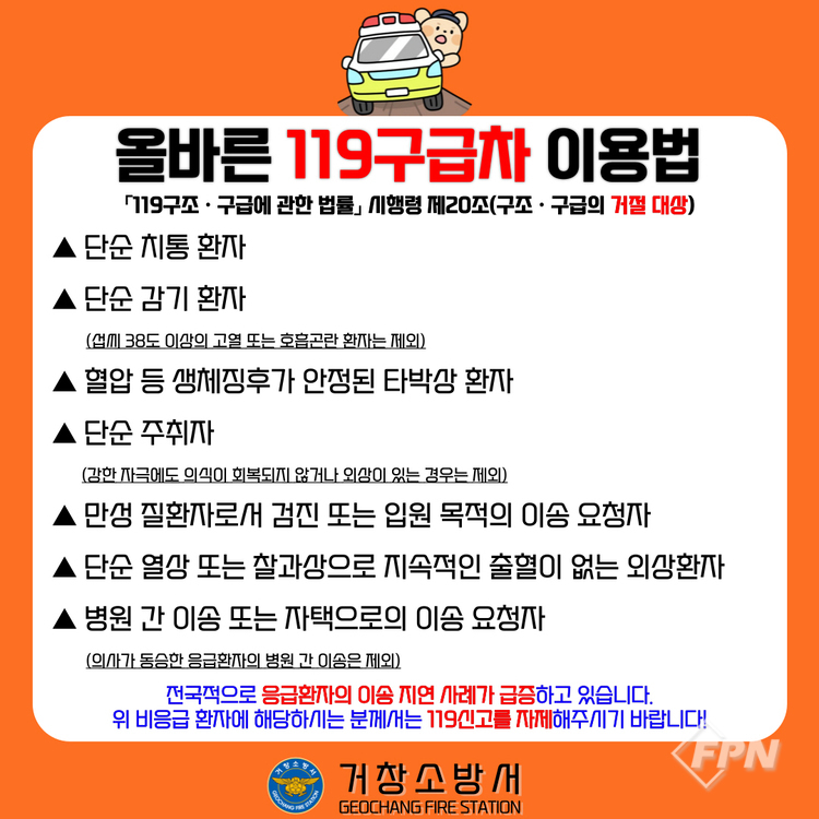 [FPN 정재우 기자] = 거창소방서(서장 강호봉)는 비응급 이용을 줄이고 위급한 응급환자에게 골든타임 내 신속한 이송이 이뤄질 수 있도록 구급차 이송 거절 사유를 군민에게 적극 홍보 중이라고 9일 밝혔다.