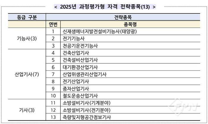 ![]() ▲ 한국산업인력공단이 지난달 16일 공고한 ‘2025년도 과정평가형 국가기술자격 신규 종목 추천 수요조사 및 전략 종목 국민 의견수렴 안내문’에는 과정평가형 자격 전략종목으로 검토할 자격이 게재돼 있다. © FPN |