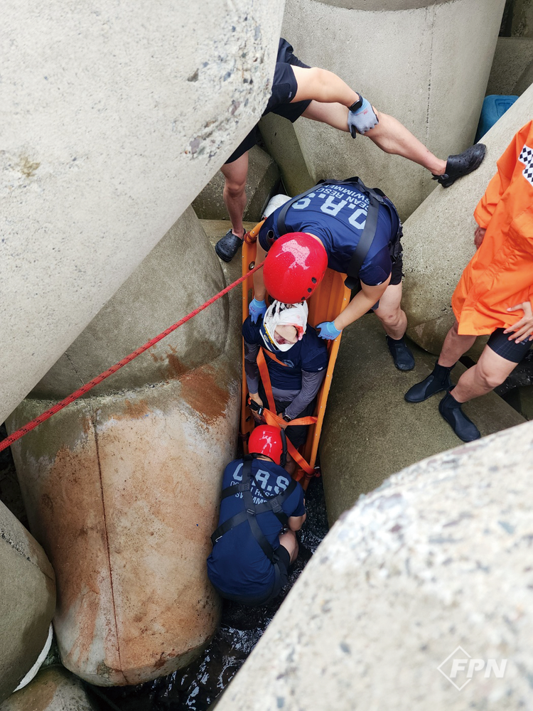 입수를 지시하는 호각을 불었다. 교육생들은 일제히 바다로 뛰어들며 서프존을 뚫고 먼바다로 수영해 나갔다. 뒤이어 테트라포드로 갔다. 낚시꾼이나 관광객들이 추락해 사고를 자주 당하는 실제 현장이다.