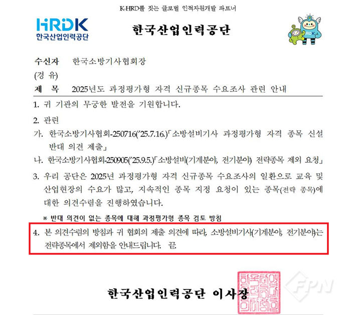한국산업인력공단(이하 인력공단)은 최근 한국소방기사협회에 소방설비기사(기계ㆍ전기) 자격을 과정평가형 전략 종목에서 제외한다는 내용의 공문을 보낸 것으로 <FPN/소방방재신문> 취재결과 확인됐다.
