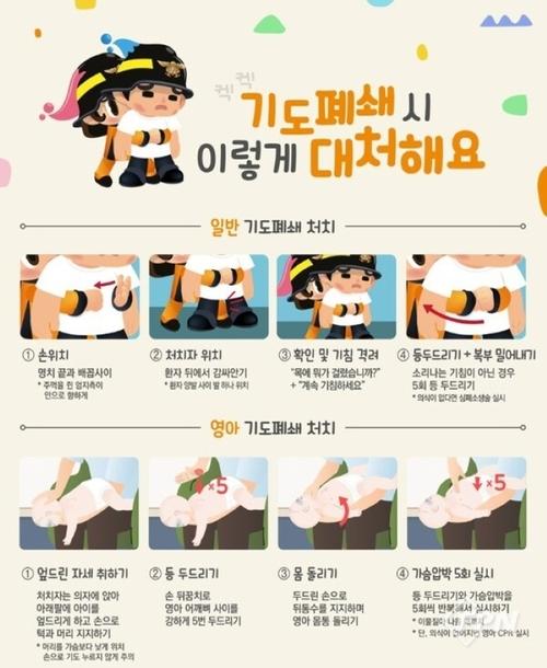 영아의 경우에는 팔 위에 엎드리게 해 어깨뼈 사이를 손바닥으로 반복해서 두드린 뒤 몸을 뒤집어 가슴을 눌러주는 방식으로 이물질 배출을 유도해야 한다.