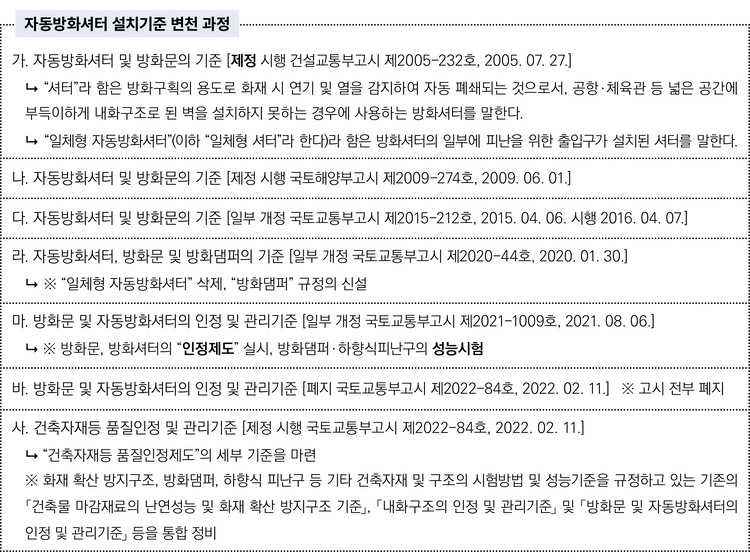 자동방화셔터는 과거와 현재의 설치기준이 많이 상이하다. 그동안 비상구가 내포된 일체형 방화셔터의 설치를 허용했지만 현재는 설치할 수 없다는 게 한가지 예다. 자동방화셔터의 설치기준이 어떻게 변화했는지 그 과정을 잘 이해해야 설치된 방화구획에 대한 적정 여부를 알 수 있다.