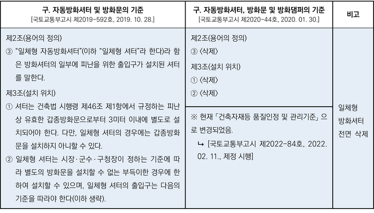일체형 자동방화셔터 내 비상 출입문의 밀폐성과 개방의 용이성, 피난자의 신속한 비상구 위치 인식 가능 여부 등에 대한 모든 것에 신뢰성이 부족하다고 생각했기 때문이다. 결국 현재는 일체형 자동방화셔터의 규정이 ‘전면 삭제(2020. 01. 30.)’돼 설치할 수 없도록 제도화됐다.