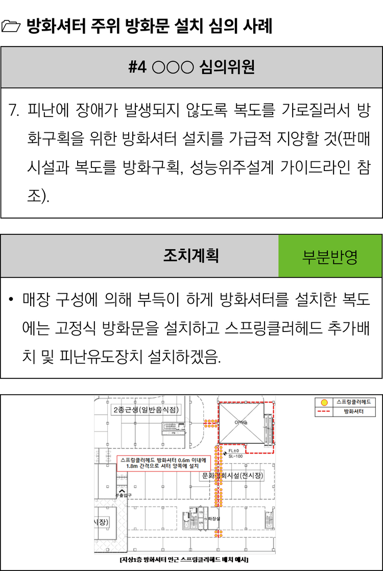 원래 자동방화셔터 설치기준의 취지는 내화구조의 벽을 설치할 수 없으면 자동방화셔터를 설치하고 그로부터 3m 이내에 갑종방화문을 설치해 방화셔터 작동으로 발생할 수 있는 피난 경로상의 위험요소를 제거하자는 것이었다.