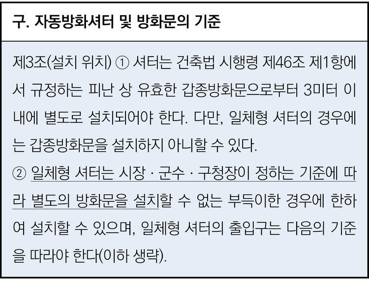 구. 자동방화셔터의 설치기준에서 ‘일체형 자동방화셔터’는 ‘방화셔터의 일부에 피난을 위한 출입구가 설치된 셔터’로 정의했다. 방화구획을 위해 자동방화셔터를 설치하는 경우에는 피난 상 유효한 갑종방화문을 3m 이내에 별도로 설치해야 한다.