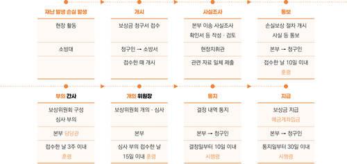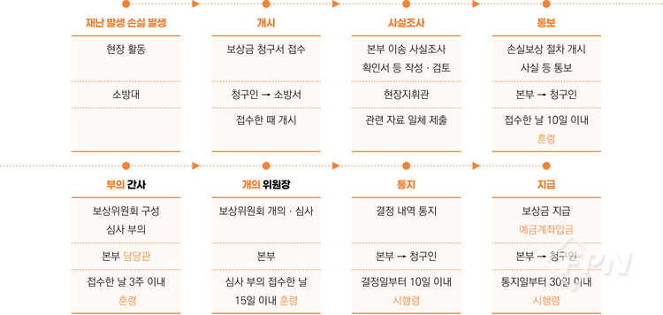 적법한 소방활동으로 인한 손실이 발생했다. 청구인이 소방서에 보상금 청구서를 접수한다. 소방서는 이를 시도 소방본부로 이송하고 현장지휘관이 사실조사 확인서 등을 작성ㆍ검토한다. 소방본부는 청구인에게 손실보상 절차가 개시됐음을 통보한다.
