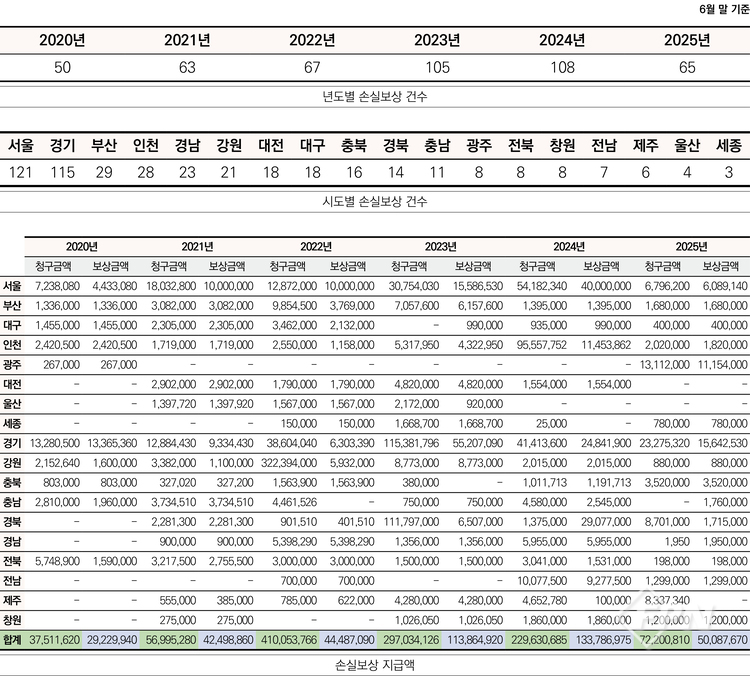 소방청 조사 결과 2020년부터 올해 6월까지 손실보상 건수는 2020년 50, 2021년 63, 2022년 67, 2023년 105, 2024년 108, 2025년 65건으로 해마다 늘고 있다. 시도별로 보면 서울이 121건으로 가장 많았고 이어 경기 115, 부산 29, 인천 28, 경남 23, 강원 21, 대전 18, 대구 18, 충북 16, 경북 14, 충남 11, 광주 8, 전북 8, 창원 8, 전남 7, 제주 6, 울산 4, 세종 3건 등이다.