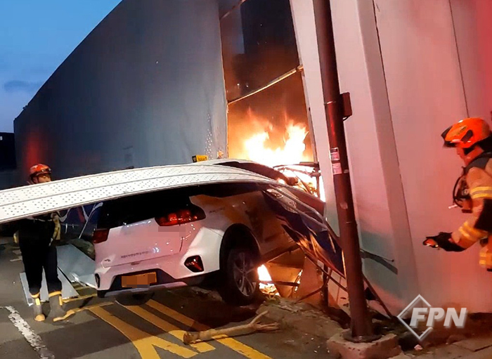 [FPN 김태윤 기자] = 1일 오전 5시 56분께 서울 종로구의 한 도로를 지나던 전기차 택시가 공사장 펜스와 추돌했고 화재로 이어졌다.