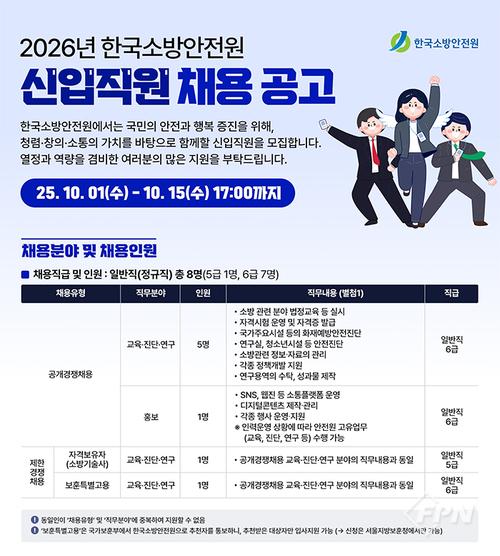한국소방안전원(원장 이상규, 이하 안전원)은 2026년 정규직 신입직원 8명을 채용한다고 2일 밝혔다. 지원서 오는 15일까지 접수한다.
