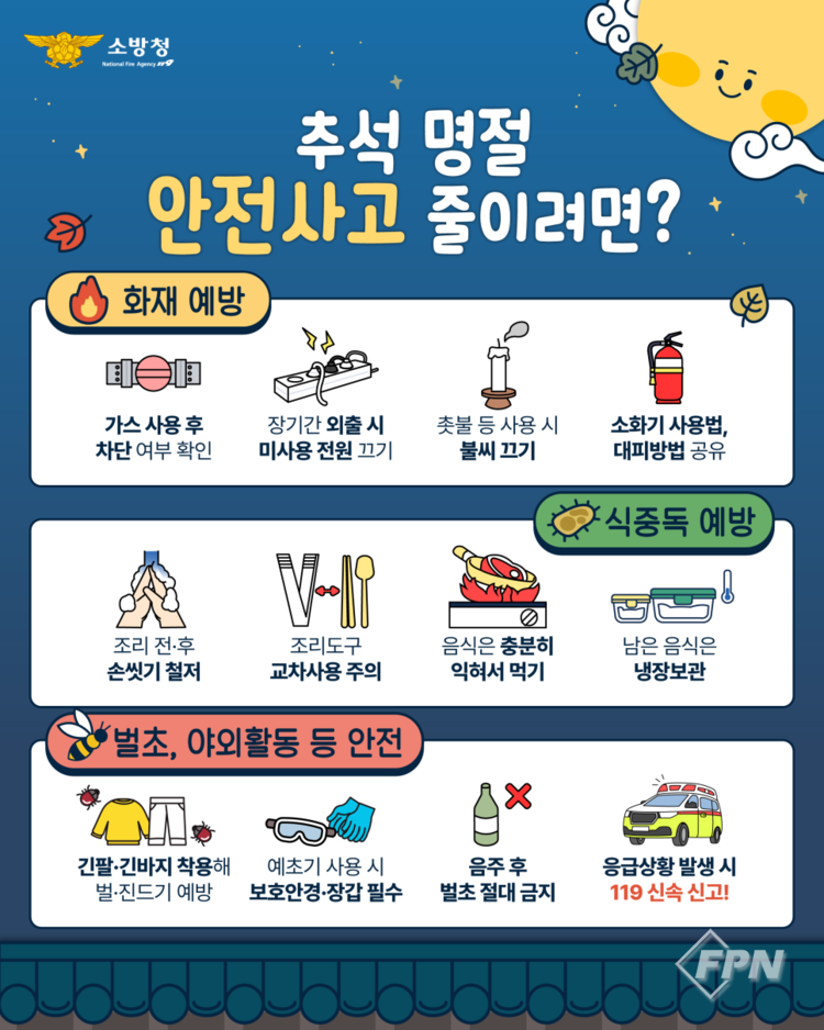 소방서 관계자는 “즐거운 명절 한순간의 부주의가 안전사고로 이어질 수 있다”며 “시민 여러분께서는 안전점검과 안전수칙 준수를 통해 가족과 이웃이 함께 안전하고 행복한 추석 명절을 보내시길 바란다”고 말했다.