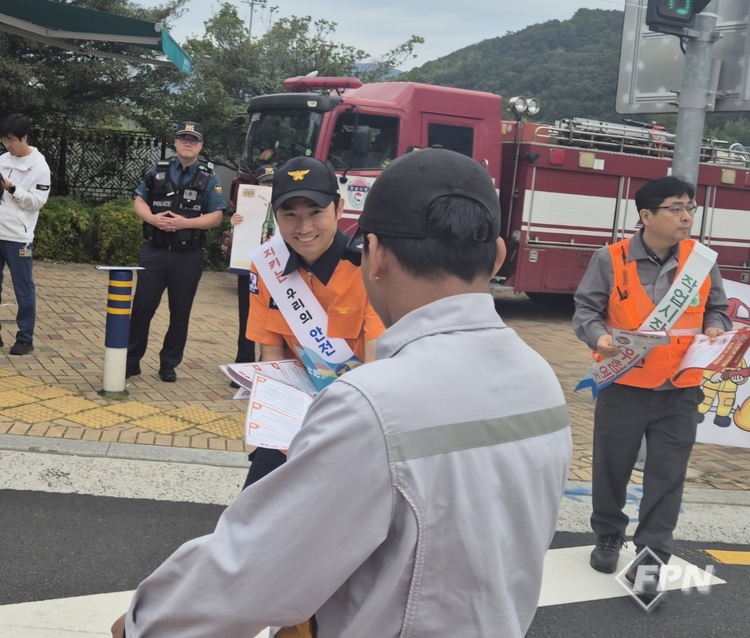 이번 캠페인은 오전 7~8시 삼성중공업 거제조선소 정문과 한화오션 서문에서 진행됐다. 행사에는 소방공무원 20명과 관계기관 관계자 20명, 의용소방대원 20명, 삼성중공업ㆍ한화오션 관계자 각 10명 등 총 80명이 참여했다.