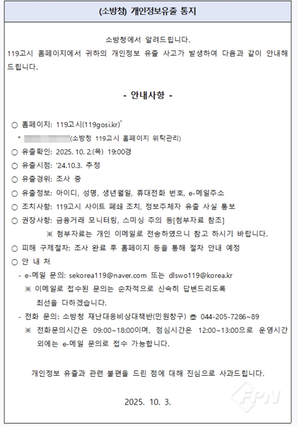 ![]() ▲ 소방청이 개인정보 유출 대상자에게 보낸 통지문 © FPN |