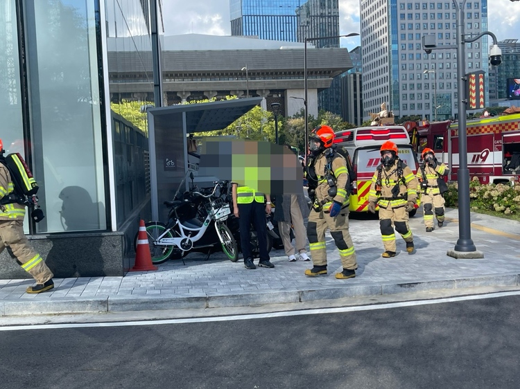 ▲ 화재 발생 사이렌이 발령되자 외부로 대피하는 KT 광화문지사 근무자들 © 종로소방서 제공