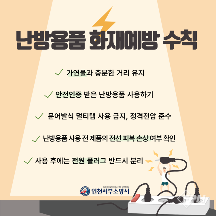 [FPN 정재우 기자] = 인천서부소방서(서장 박청순)는 난방용품 화재 예방수칙을 집중 홍보한다고 12일 밝혔다.