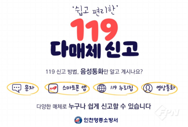 [FPN 정재우 기자] = 인천영종소방서(서장 정상기)는 시민이 보다 쉽고 편리하게 다양한 매체로 119에 신고할 수 있도록 ‘119 다매체 신고 서비스’를 안내 중이라고 24일 밝혔다.