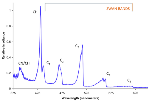 이는 탄소와 수소로 구성된 불안정한 사태라고 할 수 있는 라디칼 상태의 물질(CH 또는 C)이 빛을 발한다는 걸 보여준다.