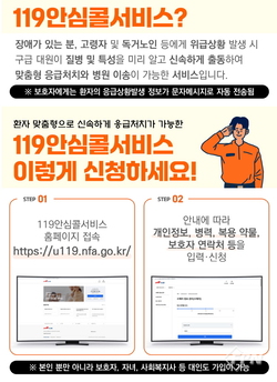 ‘119안심콜 서비스’는 응급상황 발생 시 구급대원이 출동과 동시에 환자의 질병ㆍ투약 정보ㆍ기저질환 등 주요 의료 정보를 미리 파악해 맞춤형 응급처치와 신속한 병원이송이 가능하도록 돕는 제도다. 등록된 보호자에게는 상황 발생 사실이 문자메시지로 자동 전송된다.