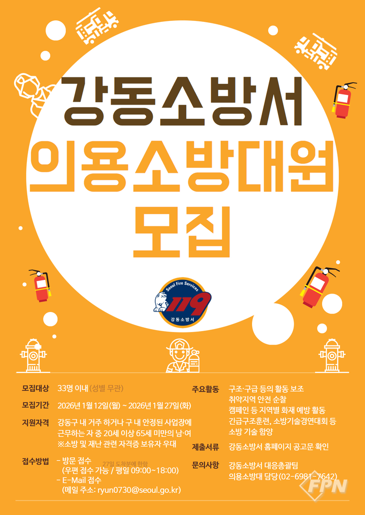 [FPN 정재우 기자] = 강동소방서(서장 김현정)는 오는 27일까지 2026년 신규 의용소방대원을 공개 모집한다고 13일 밝혔다.