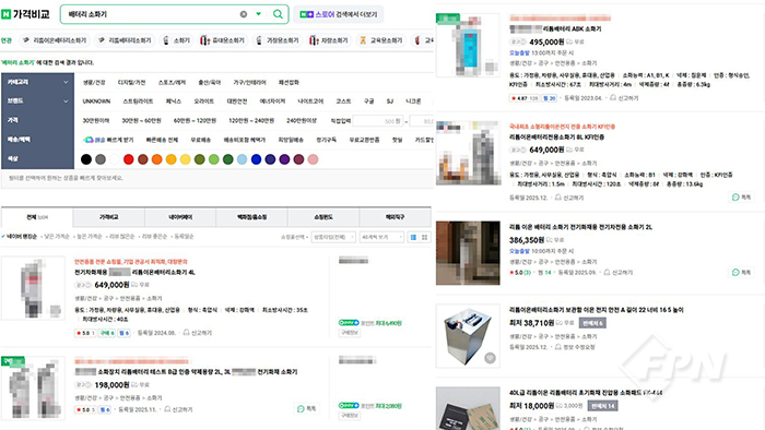 실제 온라인에선 ‘배터리 소화기’나 ‘전기차 소화기’로 검색하면 상품명에 ▲소화장치 리튬배터리 테스트 인증 ▲리튬이온 배터리 소화기 전기화재용 ▲KFI인증 리튬배터리 테스트 완료 등의 문구를 표기한 제품이 다수 확인된다. 심지어 일반 분말 소화기를 ‘리튬이온 배터리 소화장비’로 소개하는 경우도 있다.