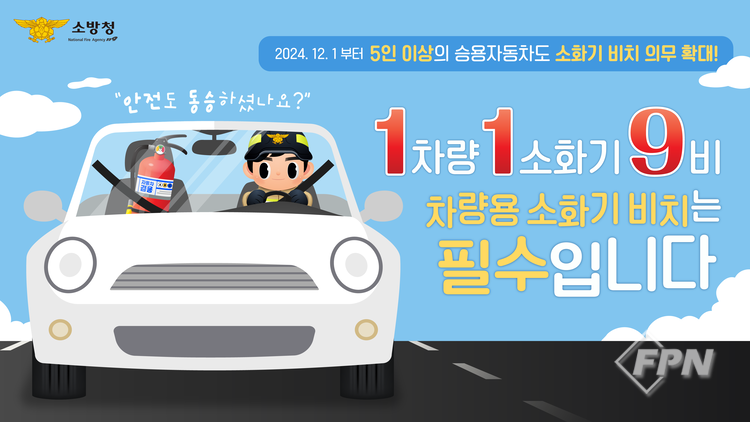 이번 홍보는 지난 2024년 12월 1일 개정ㆍ시행된 ‘소방시설 설치 및 관리에 관한 법률’에 따라 차량용 소화기 의무 설치 대상이 기존 7인승 이상에서 5인승 이상의 모든 승용자동차로 확대된 점을 시민들에게 재차 알리고자 마련됐다.