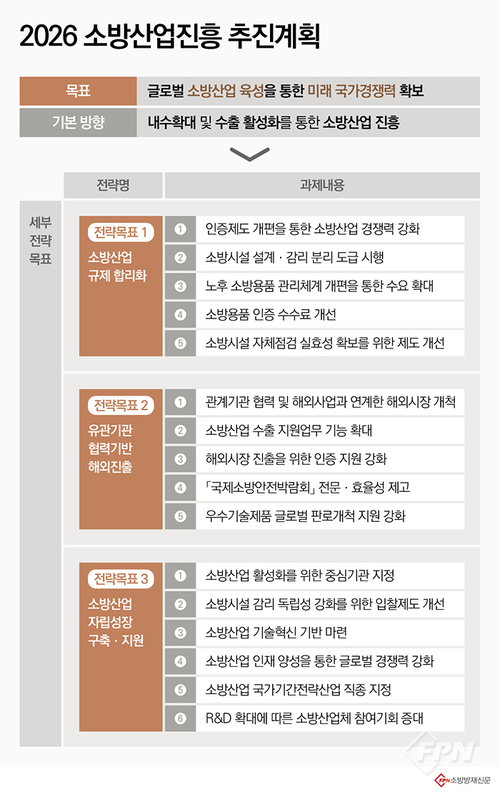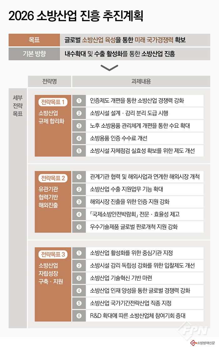 소방산업 육성을 통한 미래 국가경쟁력 확보를 위해 규제 합리화와 수출 지원, 영세업체 경쟁력 제고를 축으로 한 진흥 정책을 추진하겠다는 게 핵심 내용이다. <FPN/소방방재신문>이 올해 소방청이 추진하는 소방산업 진흥 시행계획을 하나하나 살펴봤다.