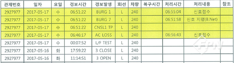 B 업체 무인경비 시스템 신호 내역에선 화재 전일 오후 5시 59분 Close와 다음 날 오전 6시 46분에 AC Loss가 확인된다. 즉 오전 6시 46분께 전원이 단전됐다. 단전은 내부 전기에서 이상이 발생했기 때문일 수도, 외부에서 끌어들여지는 전기 문제일 수도 있다.