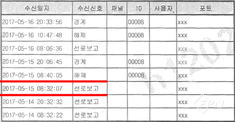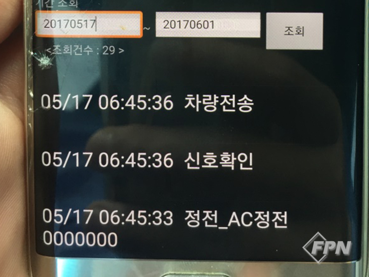 D 업체 무인경비 시스템 신호 내역이다. 오전 6시 45분에 정전 신호가 확인된다. 현장에 출동한 무인경비 시스템 직원 휴대폰에 있는 내용을 촬영했다. 화재 감지 내역 없이 정전 신호가 접수된 건 전원에 문제가 발생했기 때문일 가능성이 크다.