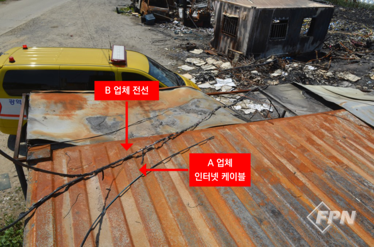 B 업체와 D 업체의 정전 신호는 차이가 있지만 업체별 신호 내역 통보 시간 지연에서 오는 현상일 수 있다. A 업체 컨테이너 위 전봇대에 연결된 전원선이 A 업체, B 업체, C 업체, D 업체 순으로 연결돼 있었다.