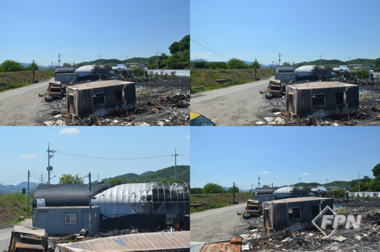 D 업체는 연소 확대로 인해 일부만 소훼된 형태다. 비닐하우스도 일부 잔류해 있고 컨테이너엔 수열 흔적이 관찰되지 않았다. A 업체와 B 업체는 전소돼 비닐하우스 철골을 철거한 모습이다.