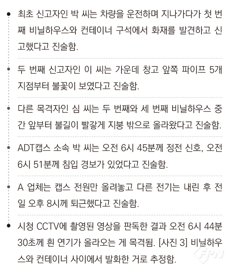D 업체와 B 업체 무인경비 시스템에서는 단전 신호가 각각 오전 6시 45분, 오전 6시 46분으로 확인된다. 최초 신고자 박 씨는 차량 운전자로 도로를 지나가면서 신고했고 첫 번째 비닐하우스 컨테이너 구석에서 불꽃이 보였다고 했다.