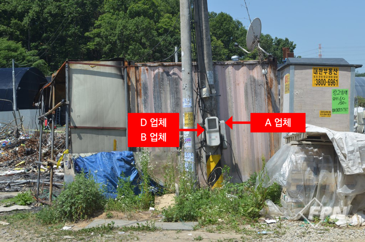 관계자에게 확인한 결과 전기선은 A 업체 컨테이너 뒤쪽에서 두 개로 연결돼 한 개는 A 업체 전용으로 사용 중이었다. 다른 한 개는 B 업체와 C 업체, D 업체로 연결돼 있었다.