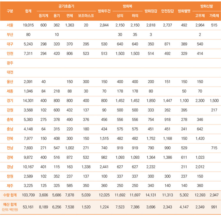 531억6천만원 투입… 개인보호장비 총 10만3709점 구매 개인보호장비 보강 예산은 지난해와 비슷한 수준으로 편성됐다. 다만 광주와 대전은 올해 개인보호장비 보강 계획을 수립하지 않은 것으로 나타났다.