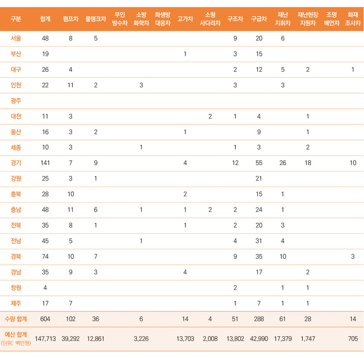• 물탱크차 재난현장에 투입돼 급수 지원 업무를 수행하는 차량이다. 128억6118만원을 투입해 36대를 보강한다. 구매 계획을 수립한 곳은 경기 9, 경북 7, 충남 6, 서울 5, 경남 3, 인천ㆍ울산 2, 강원ㆍ전북 1대 등이다. 부산과 대구, 광주, 대전, 세종, 충북, 전남, 창원, 제주는 올해 구매 계획이 없다.