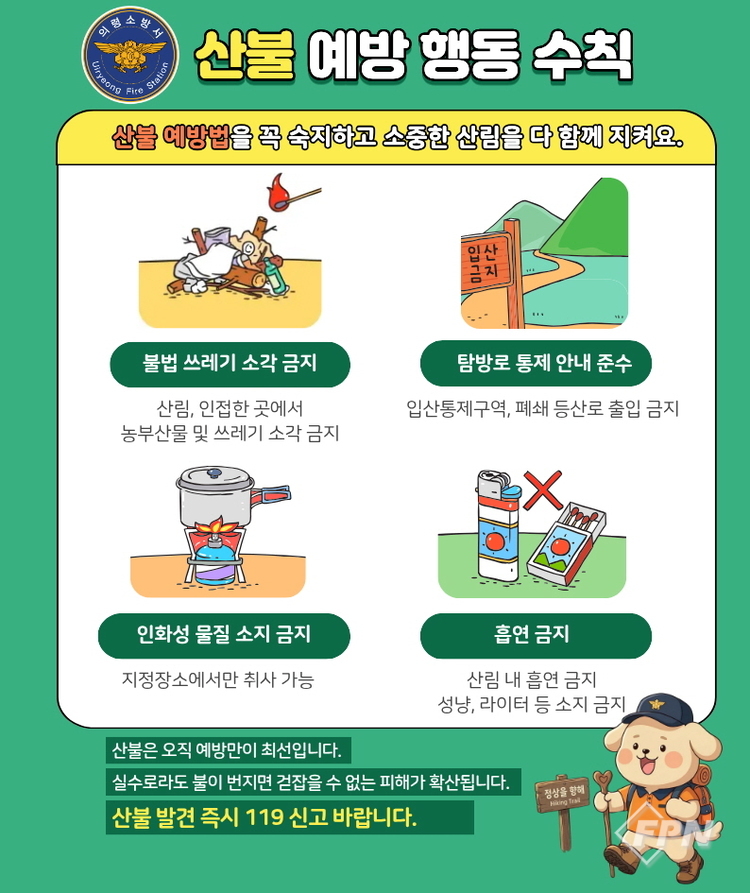산불 예방을 위해서는 ▲산림 인접 지역 논ㆍ밭두렁 및 쓰레기 소각 행위 금지 ▲입산 시 라이터, 버너 등 화기물 소지 및 사용 금지 ▲산림 내 흡연 및 취사 행위 금지 ▲입산통제구역 출입 금지 등 안전수칙을 철저히 준수해야 한다.