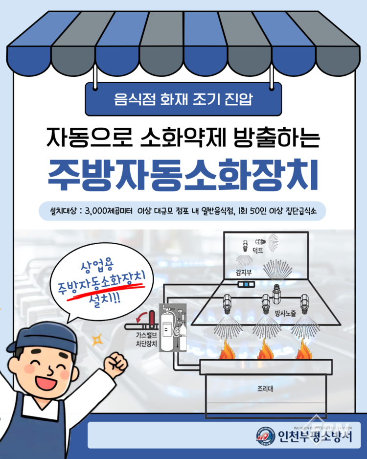 [FPN 정재우 기자] = 부평소방서(서장 강한석)는 음식점 주방에서 발생하는 화재를 예방하고 초기 대응력을 강화하기 위해 주방자동소화장치 설치 홍보에 나섰다고 24일 밝혔다.