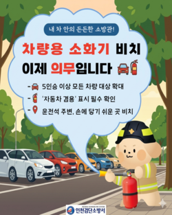 소방서에 따르면 현행 ‘소방시설 설치 및 관리에 관한 법률’에 따라 2024년 12월 1일부터 차량용 소화기 의무 비치 대상이 기존 7인승 이상에서 5인승 이상의 모든 승용자동차로 확대 시행되고 있다.