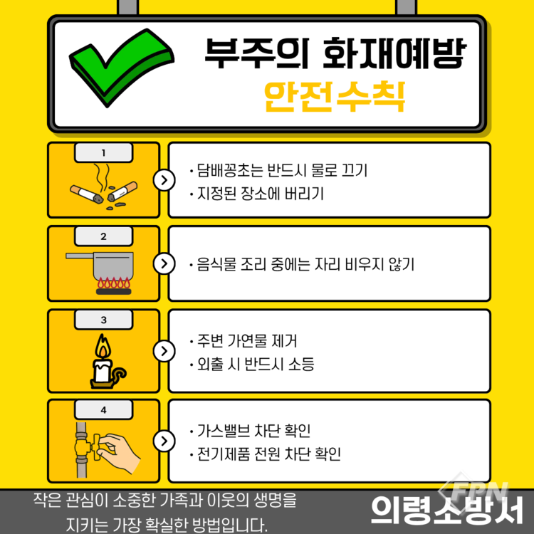 [FPN 정재우 기자] = 의령소방서(서장 강두훈)는 봄철 화재 예방을 위한 생활 속 안전수칙을 집중 홍보한다고 25일 밝혔다.
